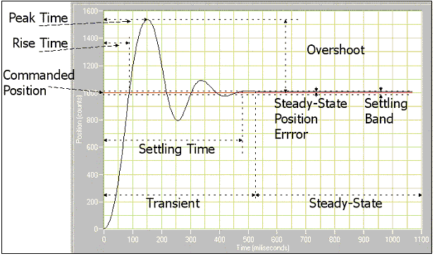 Settling Time—the time required by the response curve to reach and stay within a range that is approximately the final value of size specified by the absolute percentage of the final value (2% to 5%). Rise Time—the time required by the response to rise from 10% to 90% of its final value; the faster the response time of the system, the faster the rise time. Peak Time—the time required for a response to reach the first peak of the overshoot. Maximum Overshoot—the maximum peak value of the response curve measured from the desired position. The maximum overshoot directly indicates the relative stability of the system. Commanded Position—the desired position. In this case, the commanded position is 1,000 counts from 0. Steady-State Position Error—the error that occurs when the system is at rest. Settling Band—the area the position must be within in order to determine settling time. Note: Part IV of this document outlines what actions to apply in order to modify a Step Response chart and set the system into a stable state.