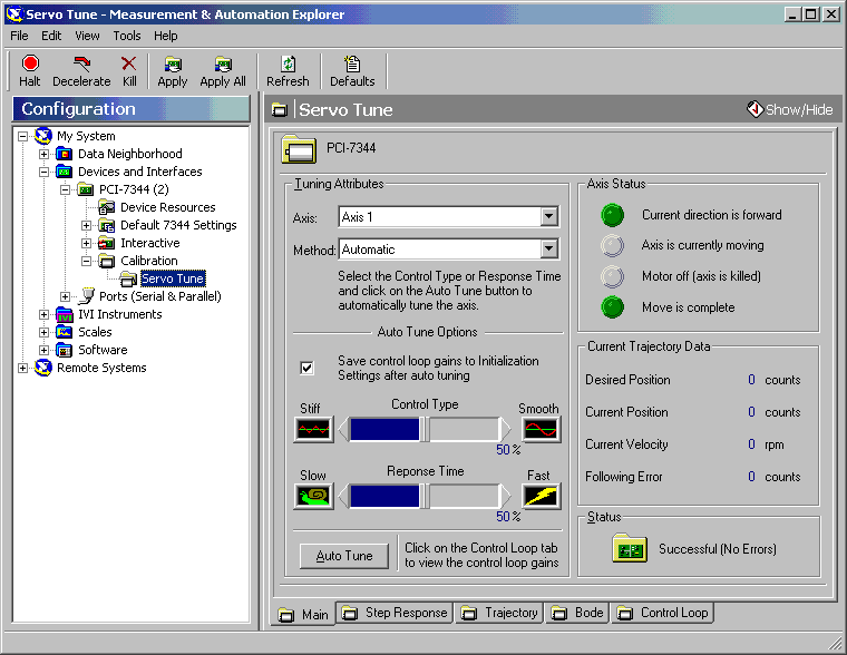 GETTING STARTED: ACCESSING SERVO TUNE Follow these steps to access Servo Tune: 1. Launch MAX. 2. Expand the Devices and Interfaces branch on the configuration tree. 3. Expand PCI-7344. 4. Expand Calibration, and click Servo Tune. The following figure shows the Servo Tune interface.