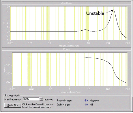 STABILITY IN THE FREQUENCY DOMAIN Use bode plots to measure system stability. At low frequencies, the gain is 0 dB for most systems and diminishes as frequency increases. A rise in gain before a fall in gain indicates marginal stability. For most systems, the allowable rise in gain before falling is below 6 dB, indicating approximately 50% overshoot. You can use the bode plots to ensure that at all significant velocities are stable given the PID parameters. Gain margin is the gain of the system when the phase is at –180 degrees. Phase margin is the difference between the actual phase and –180 degrees when the gain is at 0 dB. Typically, the phase margin should be between 35 and 80 degrees for a stable and responsive system. The phase margin should be as large as possible. The gain margin should be between 10 and 25 dB. The following graph represents an unstable system. The rise in gain before eventually falling is around 10 dB. This system is unstable at frequencies of approximately 100 radians/sec and higher.