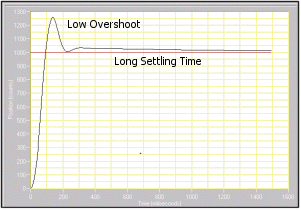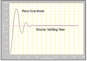 6. Decrease the proportional gain (Kp) by a factor of 2 from its original value (or a factor of 4 from its current value). Decreasing by a factor of 2 works for most systems, but if your system becomes too sluggish reduce this factor appropriately. 7. Examine the step response plot. It should resemble Figure 3. As you decrease the proportional gain, the rise, peak, and settling times increase, producing a smoother, slower response. As you decrease Kp, the maximum overshoot decreases as well. Decreasing by a factor of 2 usually results in a noticeably more damped system. If this is not true for your particular system, try decreasing the gain even more.